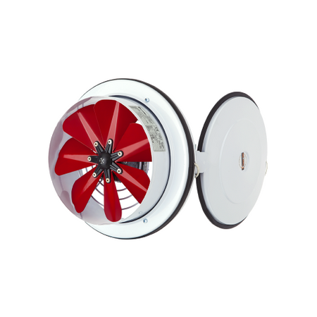 • Axialventilator mit Klappe aus pulverbeschichtetem Stahlblech.